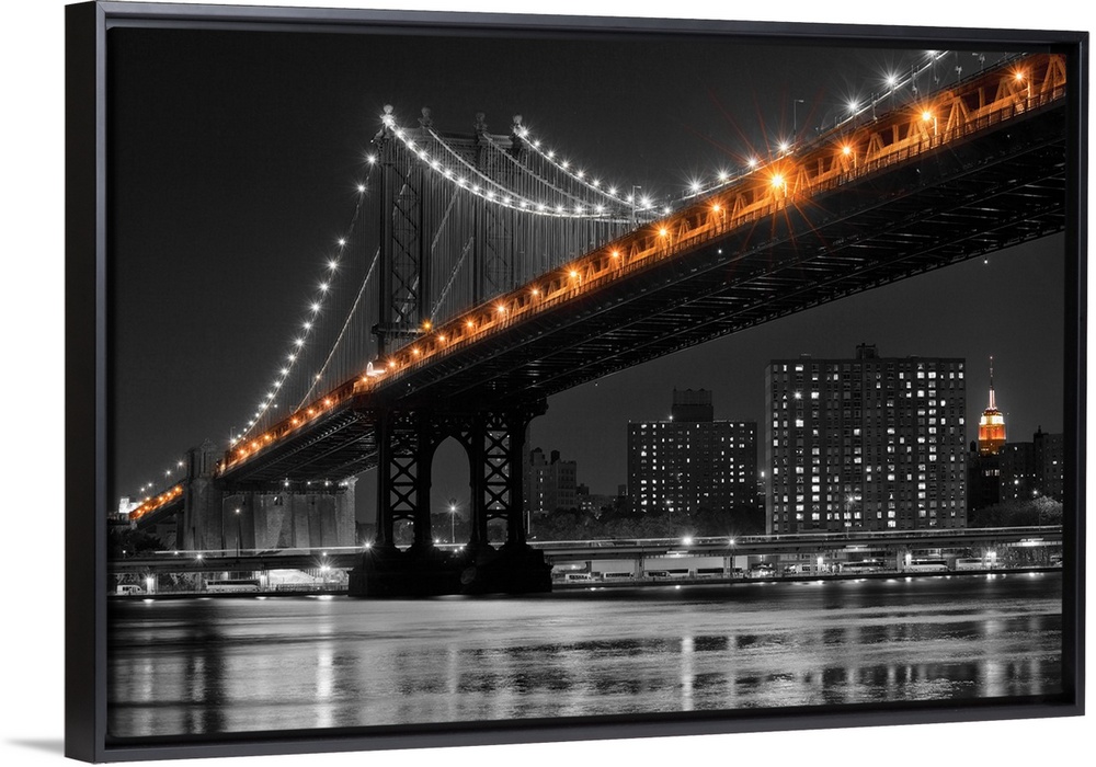 <p>Black and white photograph of the Manhattan Bridge at night with only the lights in color.</p>
