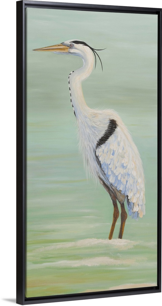 <p>Painting of a tall heron standing in shallow water.</p>