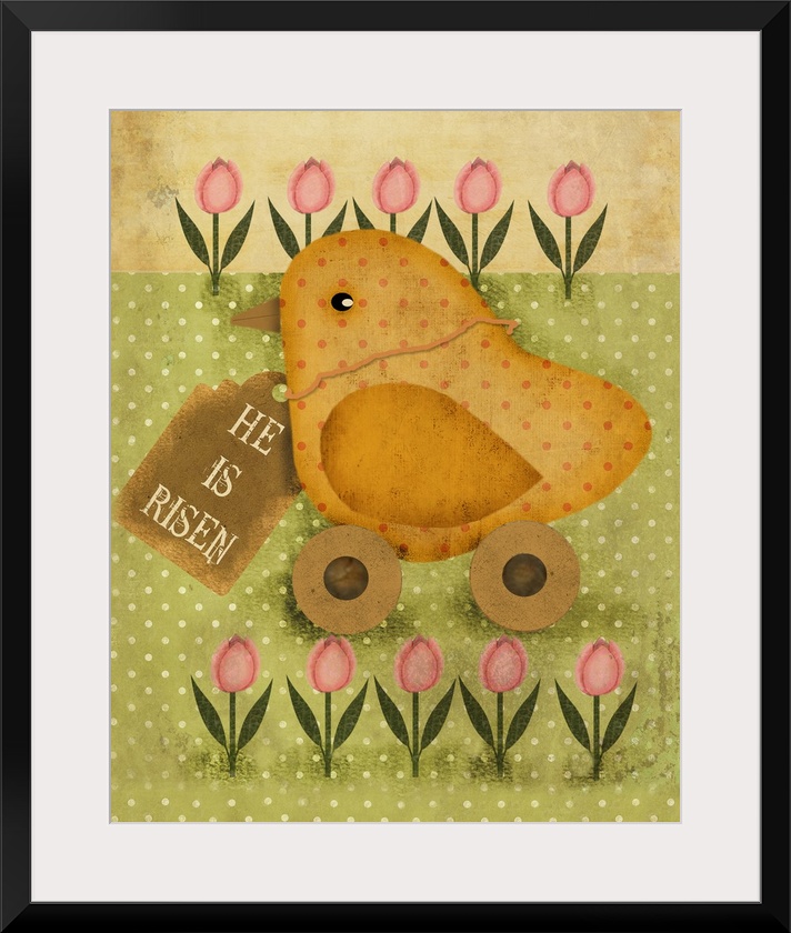 <p>Easter decor of a toy chick on wheels wearing a tag that reads "He is Risen."</p>
