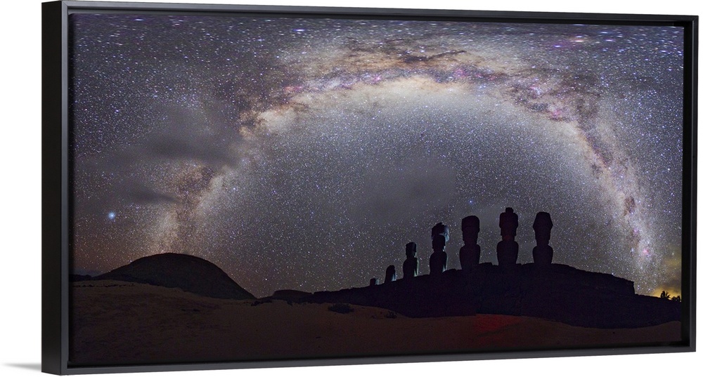 <p>Easter Island moai and Milky Way. Panoramic view of the arch of the Milky Way in the night sky over silhouetted moai statues on Easter Island (Rapa Nui) in the South Pacific. The moai are megalithic statues carved from volcanic rock from around 1000-1500 AD. This is Ahu Nao-Nao, one of the two ahu of moai on Anakena beach. Photographed in July.</p>