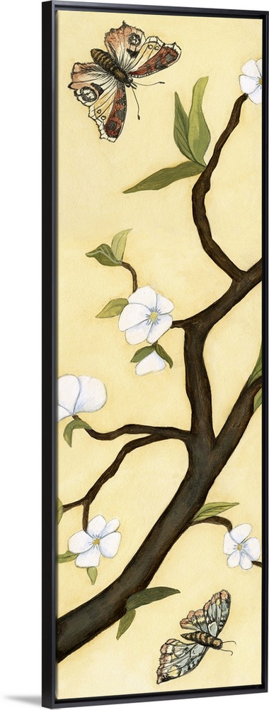 <p>Contemporary decor artwork of white flowers on a dark brown tree branch against a pale yellow background.</p>