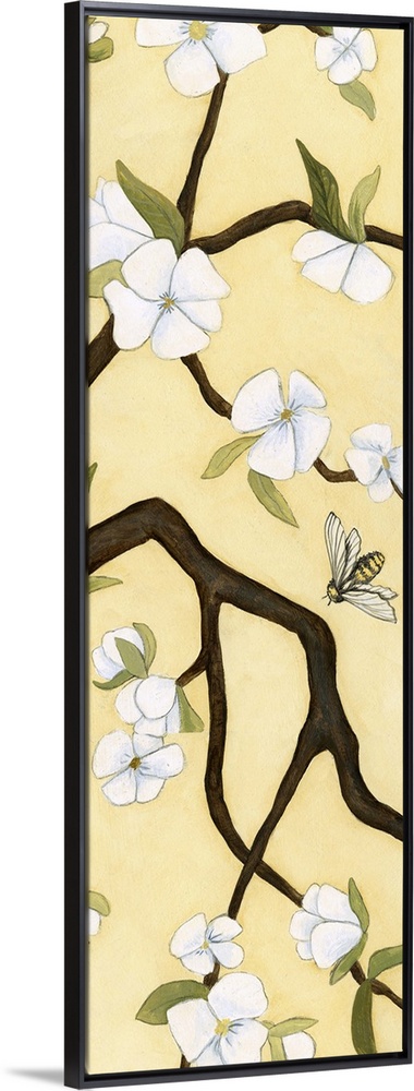 <p>Contemporary decor artwork of white flowers on a dark brown tree branch against a pale yellow background.</p>
