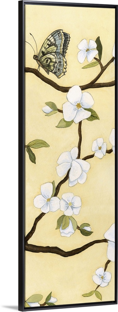 <p>Contemporary decor artwork of white flowers on a dark brown tree branch against a pale yellow background.</p>