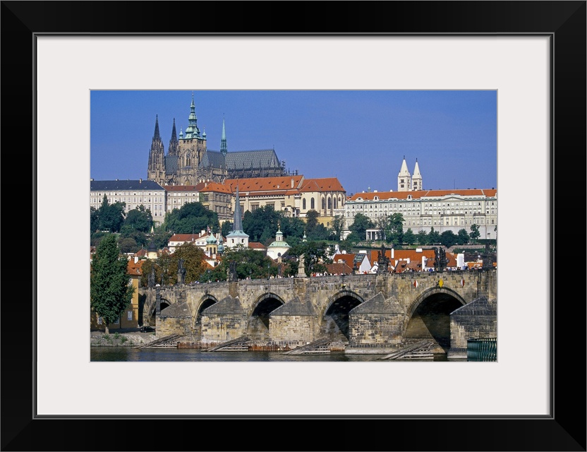 <p>Eastern Europe, Czech Republic, Prague, St. Charles Bridge across the Vltava River with Prague Castle and St. Vitus Cathedral in the background.</p>