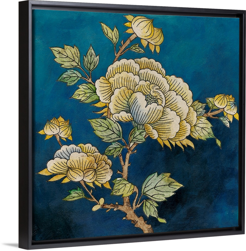 <p>Contemporary artwork of eastern inspired flowers against a dark blue background.</p>