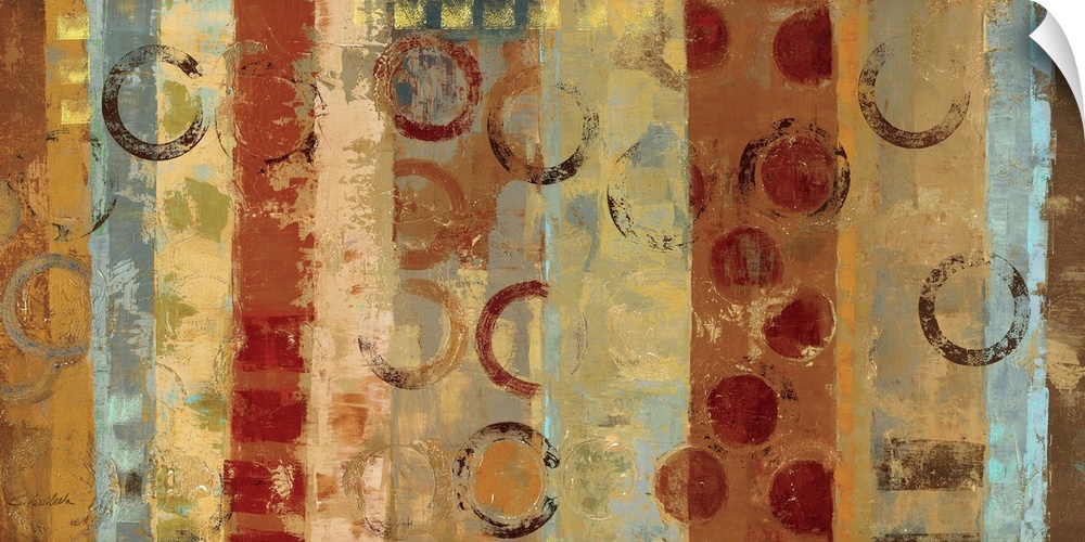 <p>Abstract art featuring lines of color interspersed with circular shapes and designs.</p>