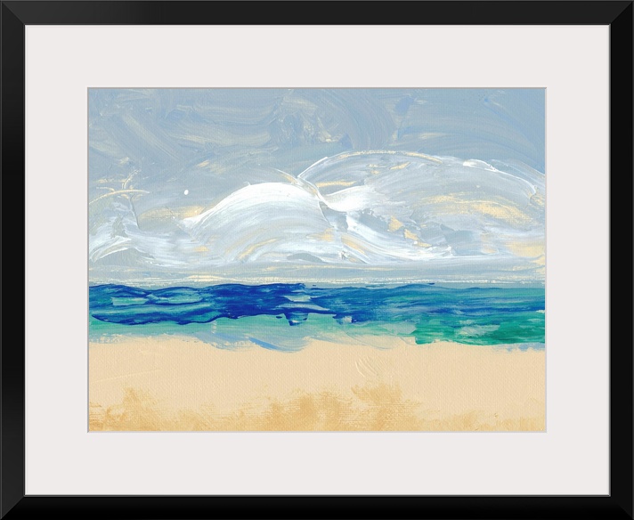 <p>Abstract painting using color placement to convey the image a beach.</p>