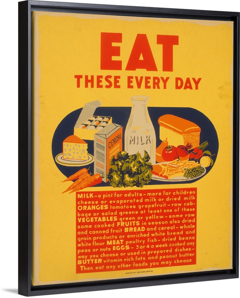 <p>Artwork promoting consumption of healthy foods, showing dairy products (milk, cheese), eggs, fruit, vegetables, bread and cereal, and meat.</p>