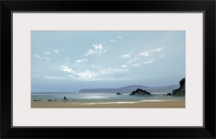 <p>Contemporary painting of a pale blue sky over a wide sandy beach.</p>