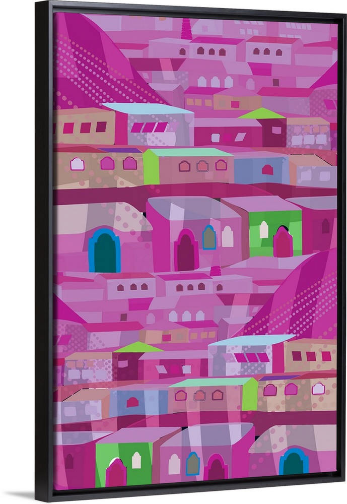 <p>A vertical illustration of rows of houses in various shades of bright pink with accents of green.</p>