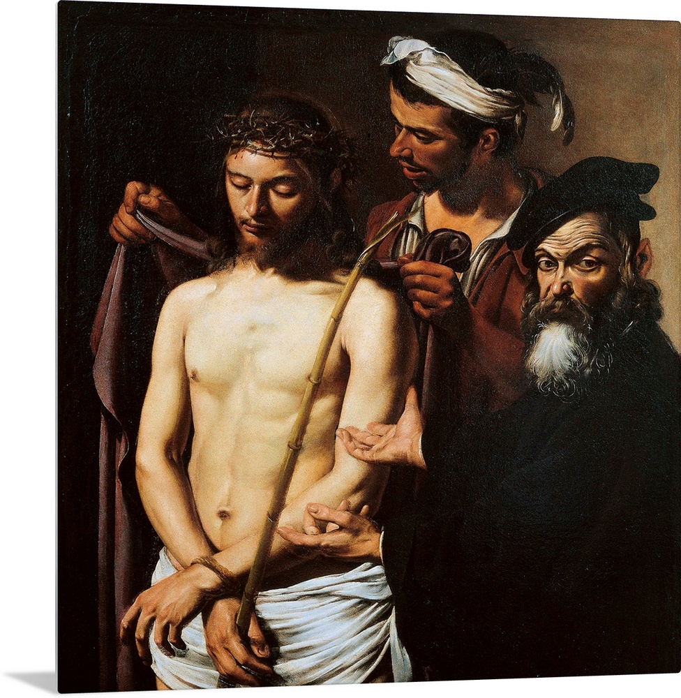 <p>Ecce Homo, by Merisi Michelangelo known as Caravaggio, 17th Century, 1605 about, oil on canvas, cm 128 x 103 - Italy, Liguria, Genoa, Palazzo Bianco Gallery. All. Ecce Homo Jesus Christ crown thorns reed cloak mantle naked burst men Pilate beard hat black</p>