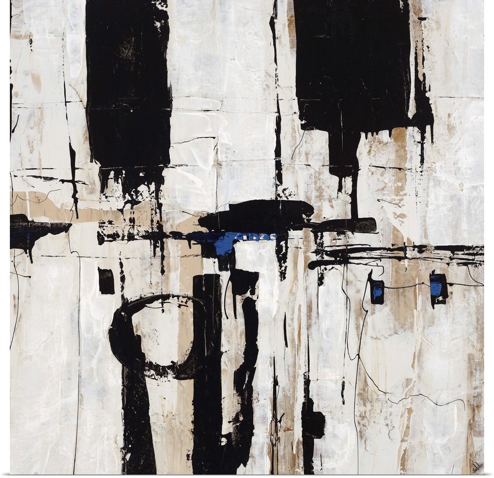 <p>Abstract painting of dark shapes and lines overlapping a light neutral background with areas of sponge texture.</p>