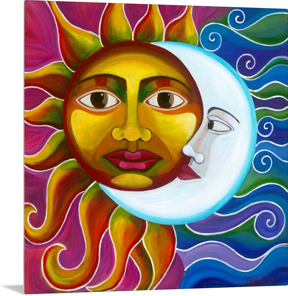 <p>Contemporary painting of a sun and moon together making one figure.</p>