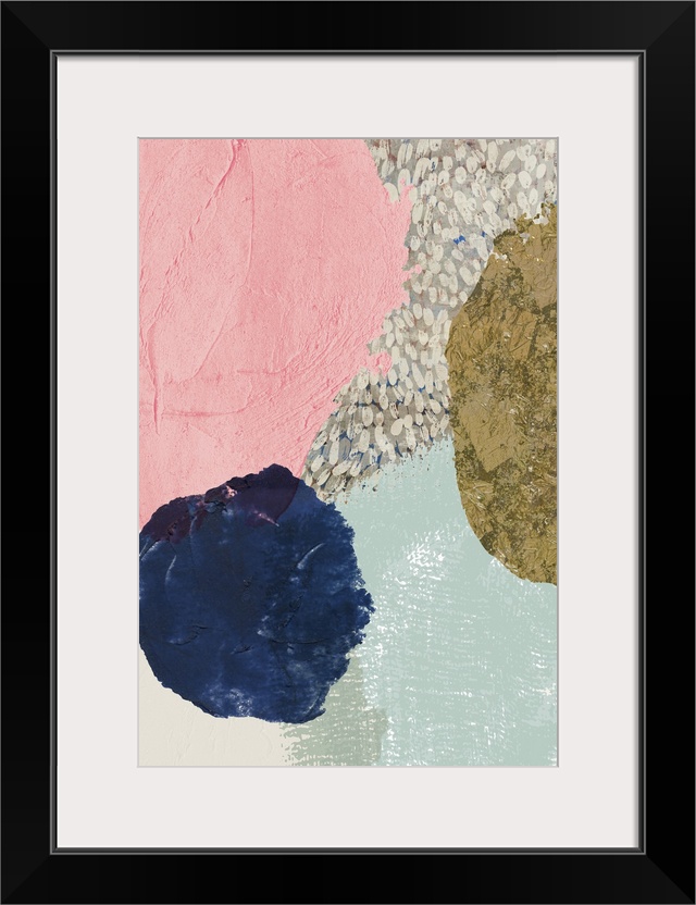 <p>Abstract artwork with circular shapes in dark navy, gold, and pink.</p>
