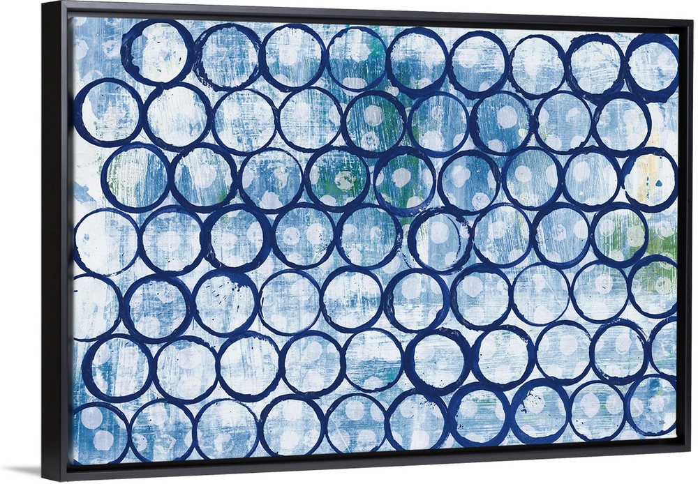 <p>Large abstract painting of indigo outlines of circles on a blue, green, and white background with smaller, solid, white circles.</p>