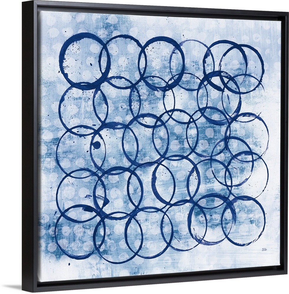 <p>Square abstract painting with indigo outlines of circles overlapping in the foreground and smaller, solid, white circles in the background.</p>