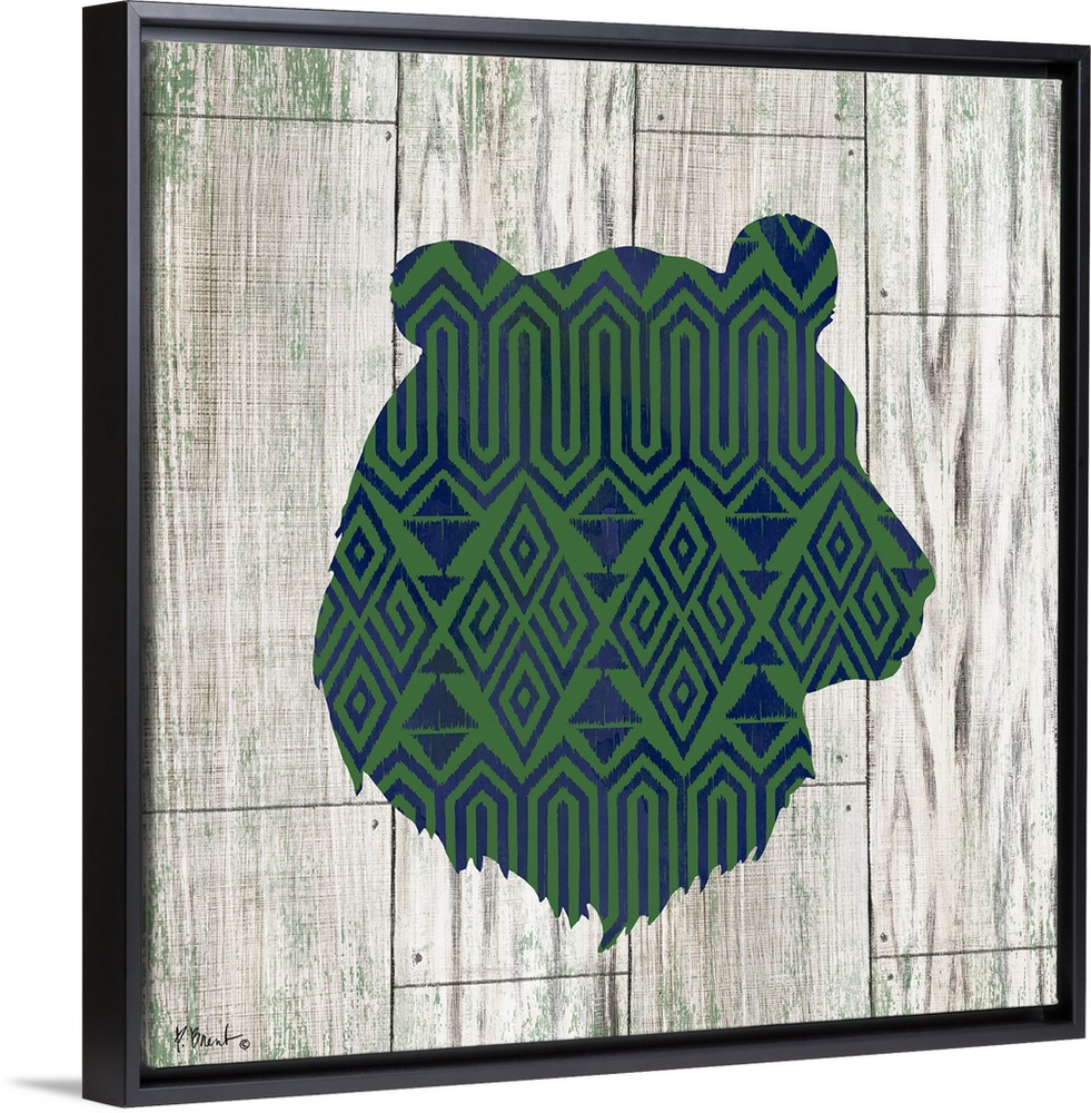<p>Square cabin decor with a blue and green patterned silhouette of a bear on a faux distressed wooden background.</p>