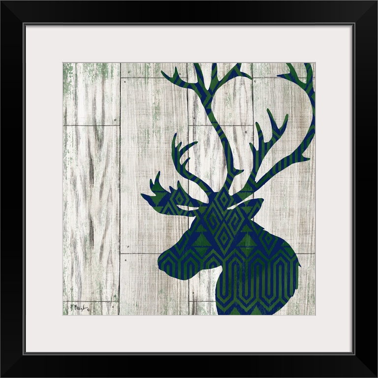 <p>Square cabin decor with a blue and green patterned silhouette of a deer on a faux distressed wooden background.</p>