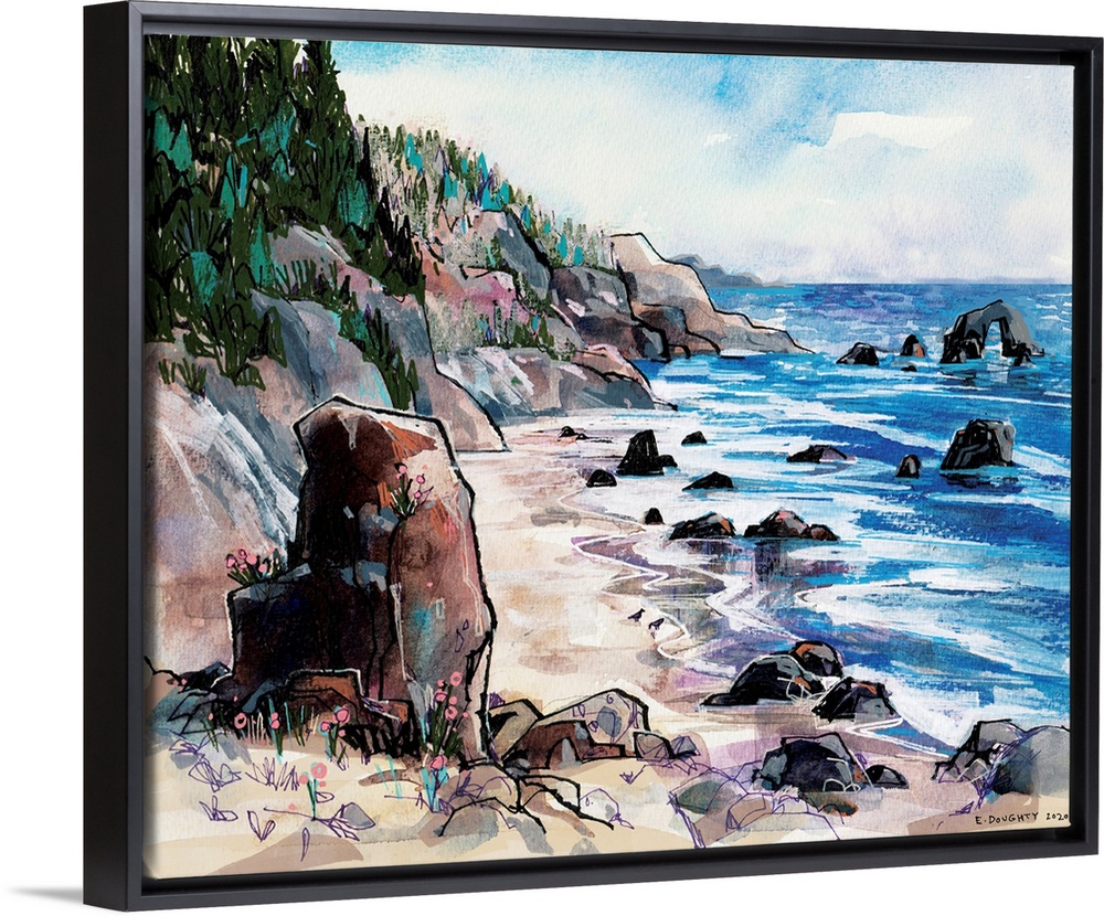 <p>Seaside painting of Ecola State Park in northwestern Oregon. The summer scene features rock formations, waves, typical pacific northwestern trees, and some stylized wildflowers. The original artwork was made in watercolor, ink, and acrylic paint.</p>