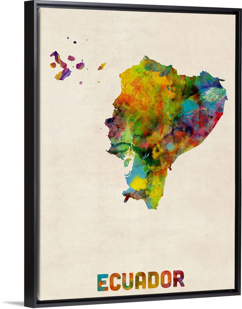 <p>Watercolor art map of the country Ecuador against a weathered beige background.</p>