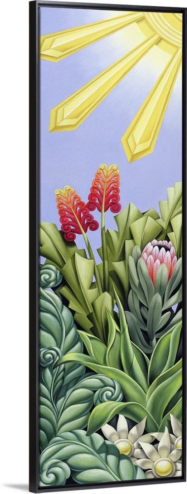 <p>Contemporary art deco-style painting of sunlight shining down on a garden.</p>