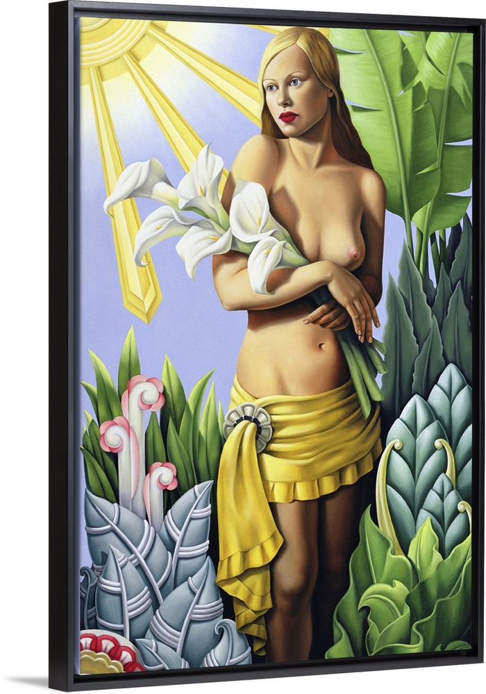 <p>Contemporary art deco-style painting of a woman holding lilies in a garden.</p>