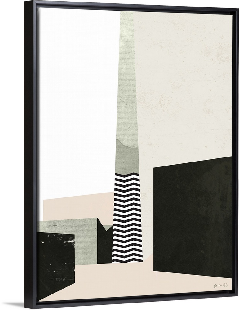 <p>Geometric abstract painting of shapes in black, beige, and pale pink.</p>