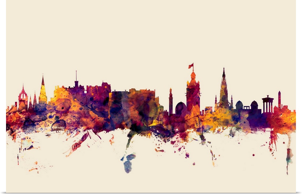 <p>Contemporary artwork of the Edinburgh city skyline in watercolor paint splashes.</p>