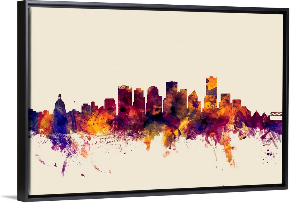 <p>Contemporary artwork of the Edmonton city skyline in watercolor paint splashes.</p>
