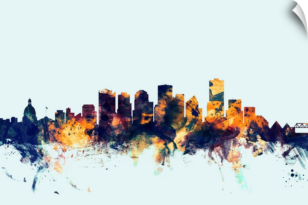 <p>Dark watercolor silhouette of the Edmonton city skyline against a light blue background.</p>