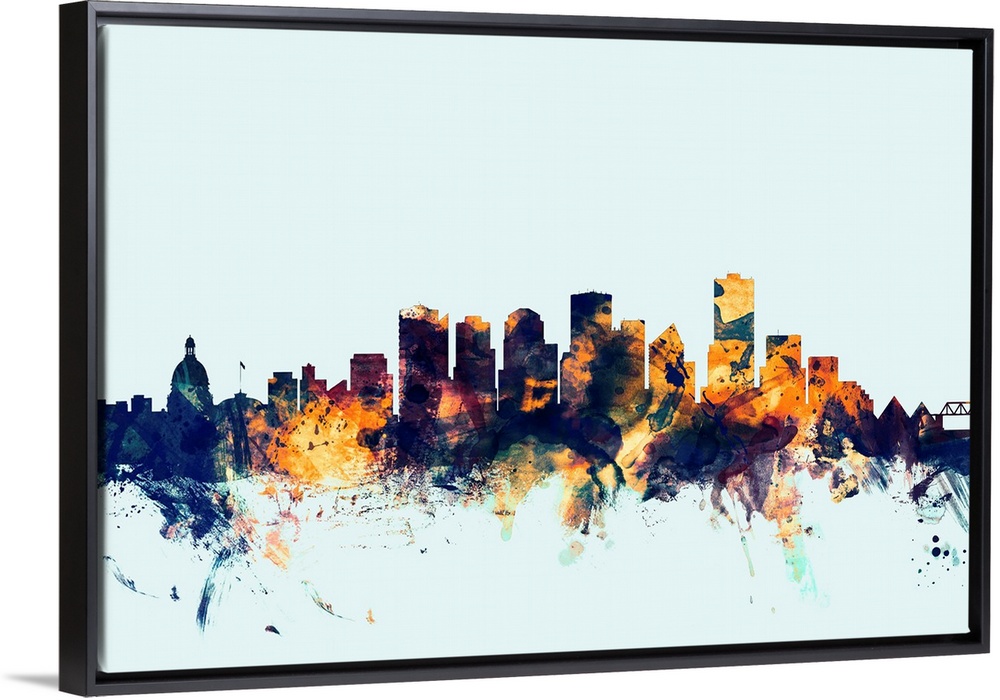 <p>Dark watercolor silhouette of the Edmonton city skyline against a light blue background.</p>