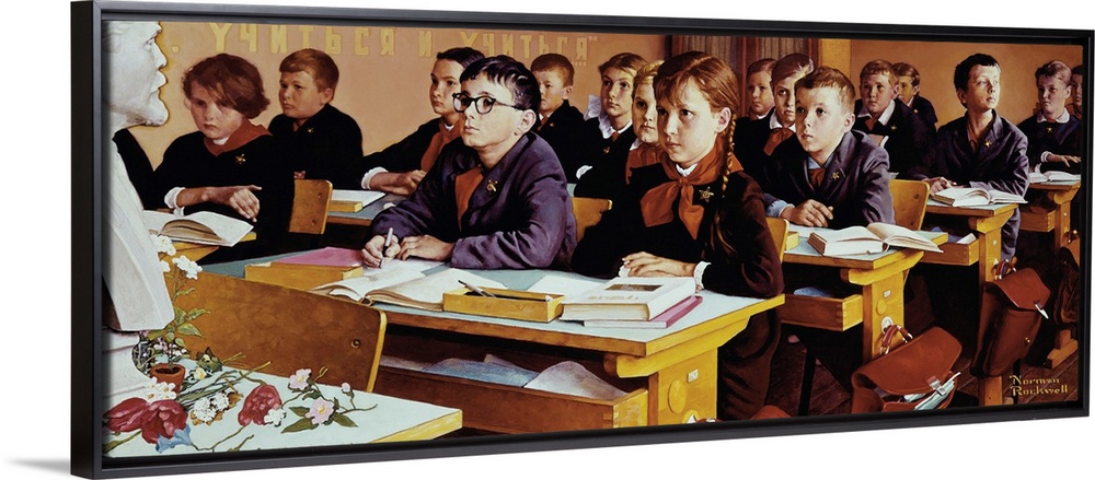 <p>In Rockwells world children disobeyed rules, adolescent girls grappled with social pressures, boys struggled with their evolution into manhood, and, in his most powerful paintings, society confronted issues of race. Many of his images of youth intended to evoke nostalgia, depict real family relationships, and memorialize the everyday. Alternate Title Russian Schoolroom. Approved by the Norman Rockwell Family Agency</p>