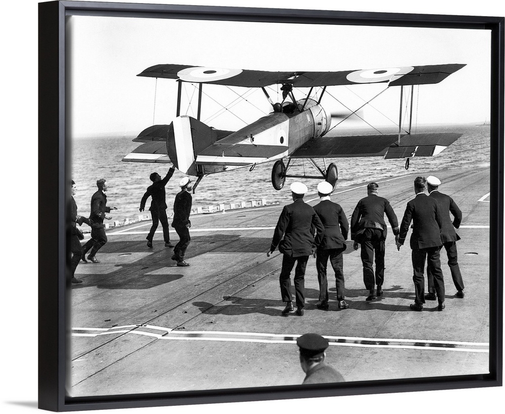 <p>Squadron Commander Edwin Harris Dunning landing his Sopwith Pup biplane on the HMS 'Furious,' the first plane ever to be landed ona moving ship, in Scapa Flow, Orkney, Scotland, 2 August 1917.</p>