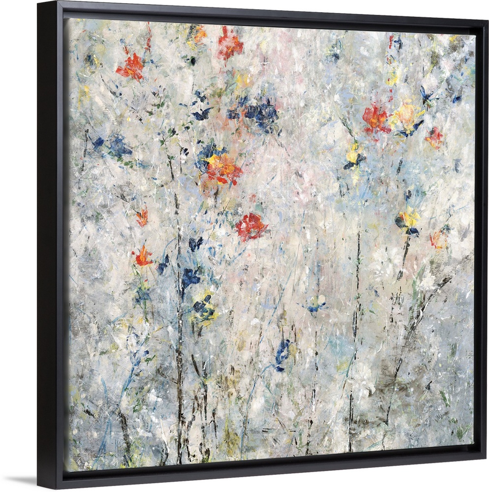 <p>Contemporary square painting with abstract flowers in blue, red, orange, and yellow hues on a gray and white background.</p>