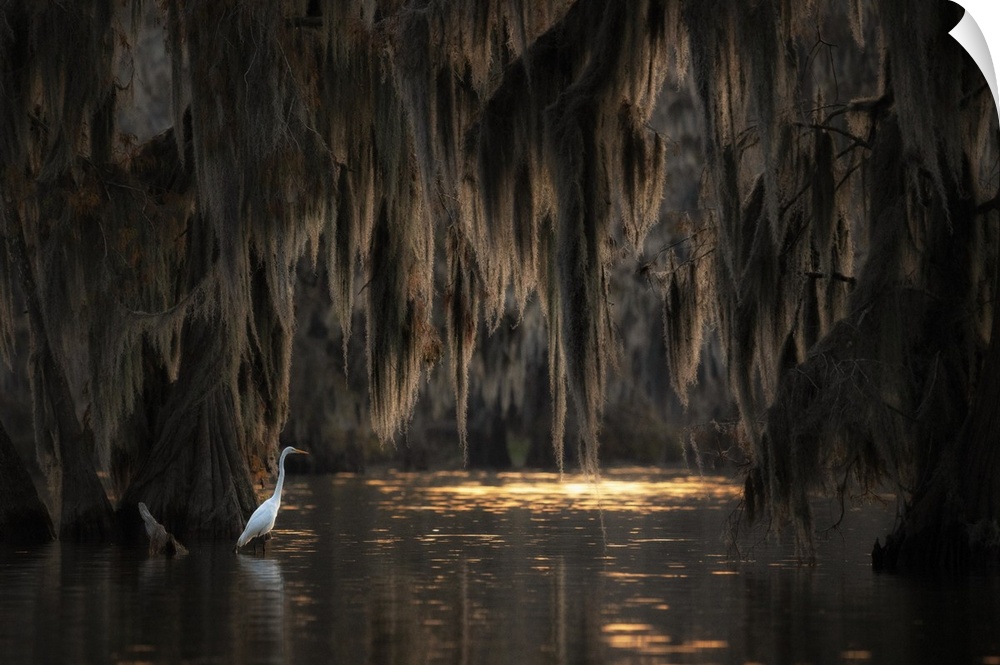 <p>Egret in Lake Martin at sunrise, Atchafalaya Basin, Louisiana.</p>
