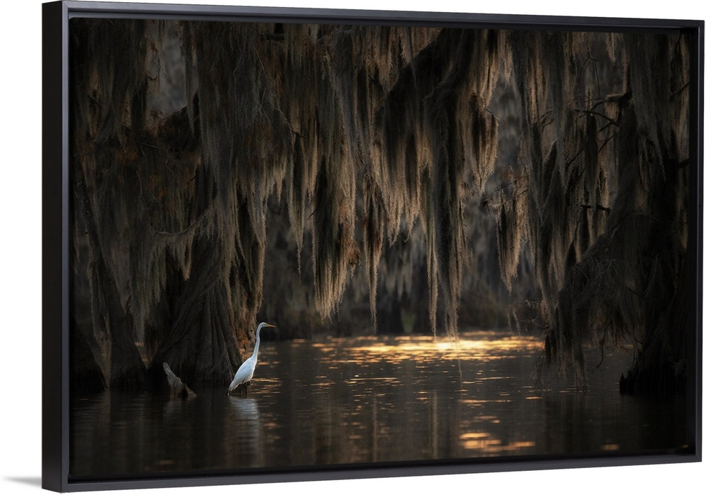 <p>Egret in Lake Martin at sunrise, Atchafalaya Basin, Louisiana.</p>