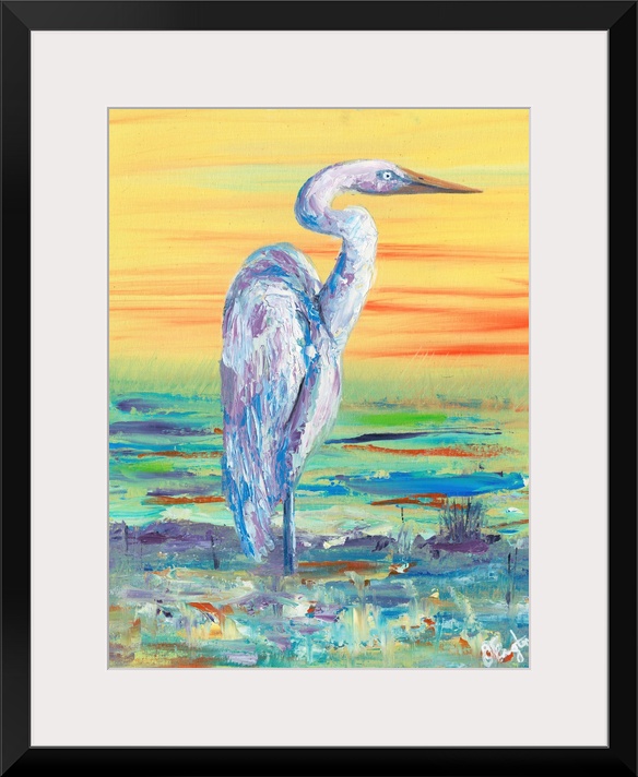 <p>Painting of a white egret standing in shallow water at sunset.</p>
