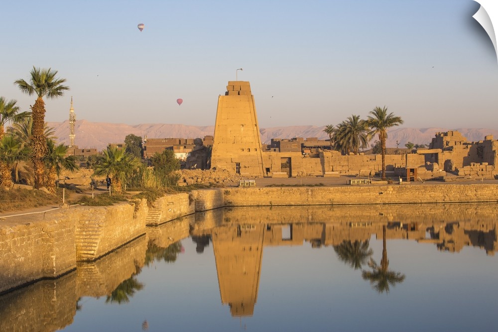 <p>Egypt, Luxor, Karnak Temple, Hot air balloons rise over the Sacred Lake</p>