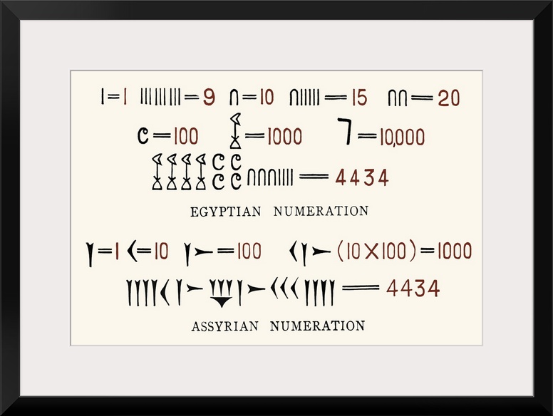 <p>Egyptian and Assyrian counting systems. Early methods of number counting involved the use of fingers, while early written records used strokes to indicate numbers. To improve these cumbersome systems, written signs were invented for higher numbers. Alternatively letters of the alphabet were adopted in their order as number signs. Here, examples of symbols for tens, hundreds, and thousands, are shown. Calculations remained cumbersome until the systematic use of zero as a number, pioneered in India. Table from The Story of the Alphabet (Edward Clodd, 1900).</p>