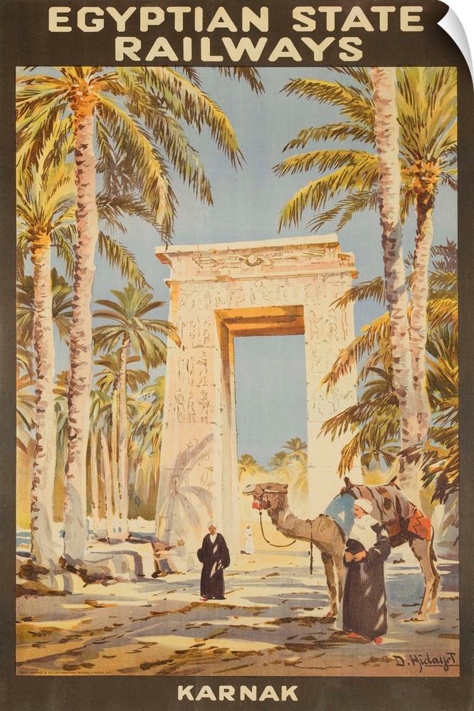 <p>1920s travel poster showing a camel and driver in fronty ancient Temple ruins in Karnak.</p>