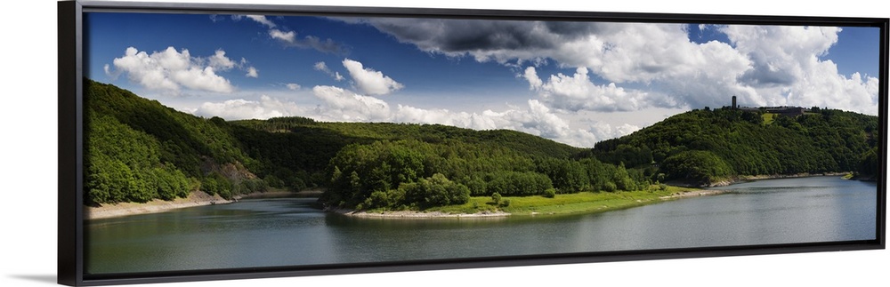<p>Panoramic photograph of a lake in the Eifel range in Germany under cloudy skies.</p>