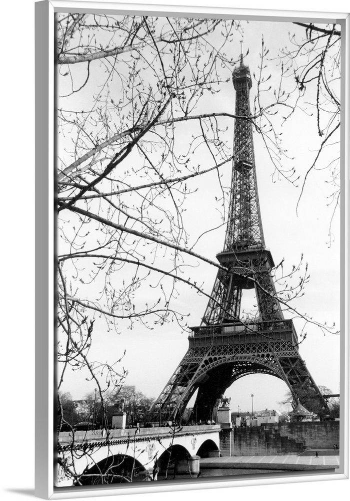 <p>View of the Eiffel Tower through the budding tree branches at the base of the Seine River.</p>
