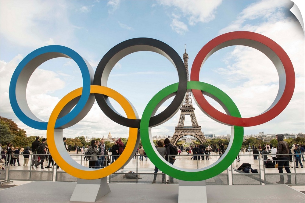 <p>Photograph of the Olympic Rings with the Eiffel Tower in the background.</p>