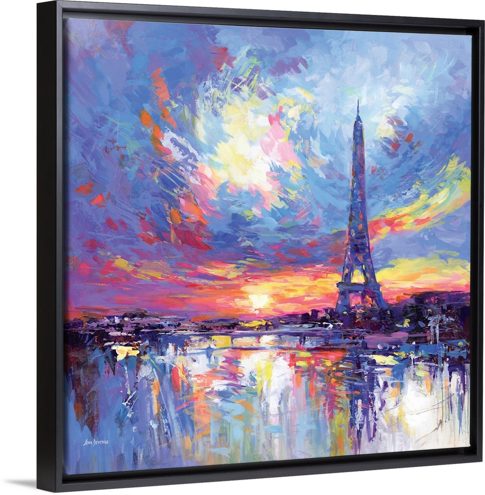 <p>A colorful abstract artwork of the Eiffel Tower at sunset, glowing against a dramatic sky filled with vibrant strokes of pink, blue, yellow, and violet. Light reflects across the water below in soft, shimmering patterns, creating a lively and romantic atmosphere. This artwork adds a radiant, uplifting touch to any home, perfect for those who love Paris, color, and the beauty of evening light.</p>
