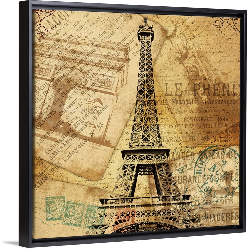 <p>Contemporary artwork of the Eiffel Tower against travel and postage documentation in sepia tone.</p>