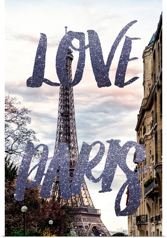 <p>A photograph of the Eiffel Tower with the phrase "Love Paris" written in silver glitter. From the Paris Fashion Series.</p>
