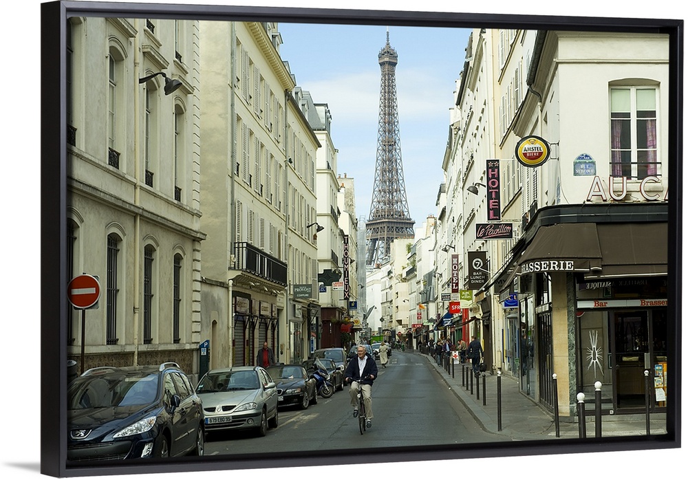 <p>Landscape photograph on an oversized canvas, looking down a street in Paris, full of cars and pedestrians, the Eiffel Tower looming over, in the center.</p>