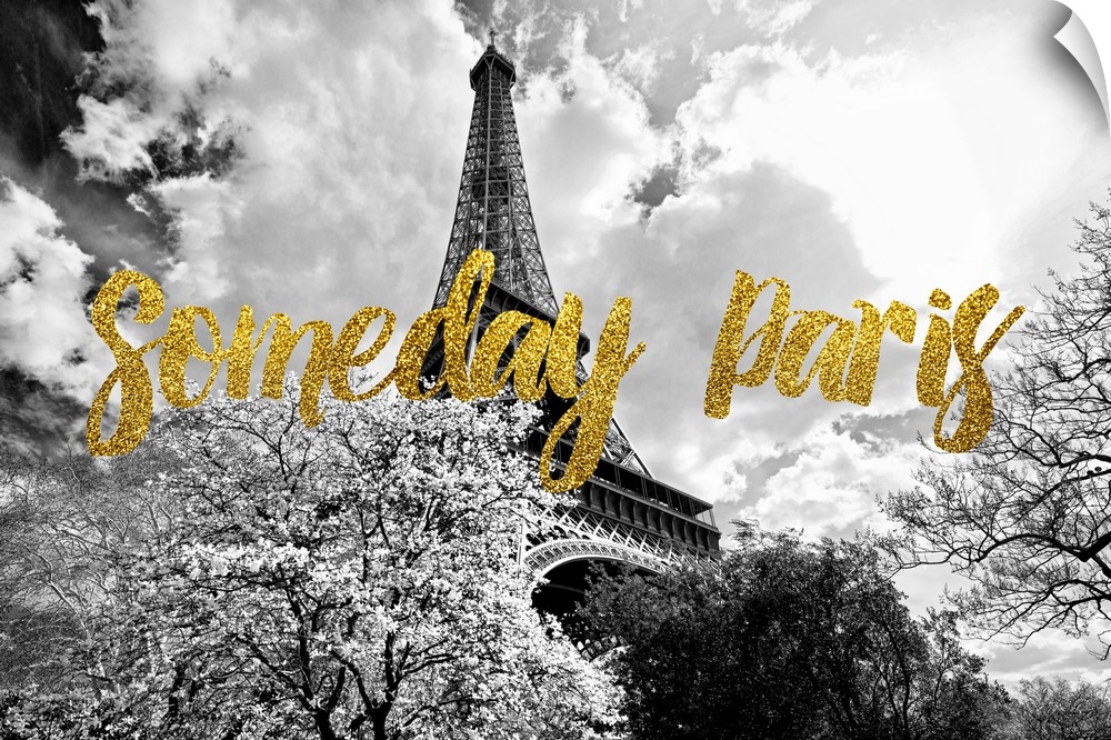<p>Black and white photograph of the Eiffel Tower surrounded by treetops with the phrase "Someday Paris" written on top in gold glitter. From the Paris Fashion Series.</p>