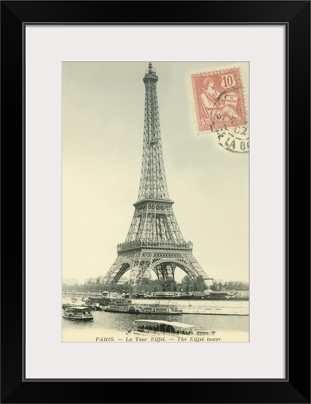 <p>Vintage postcard of the Eiffel Tower in Paris, France, with a postage stamp on the front.</p>