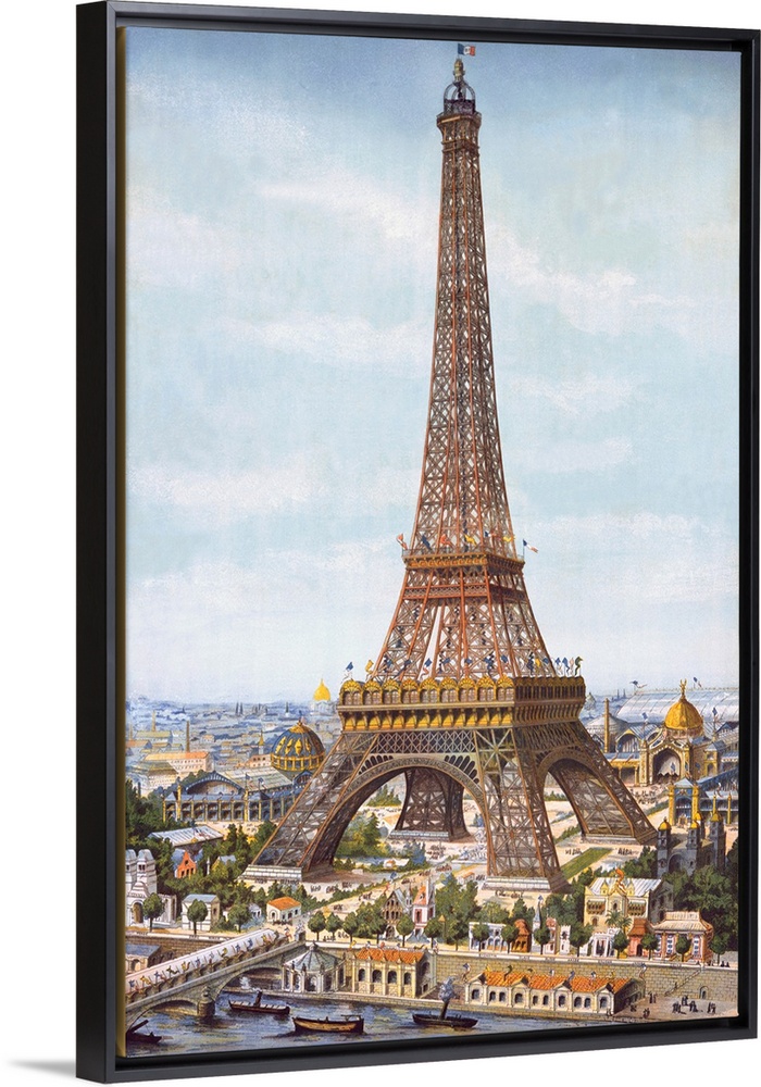 <p>An antique engraving and illustration of the iron wrought tower surrounded by pavilions and buildings some of which are no longer present in Paris.</p>